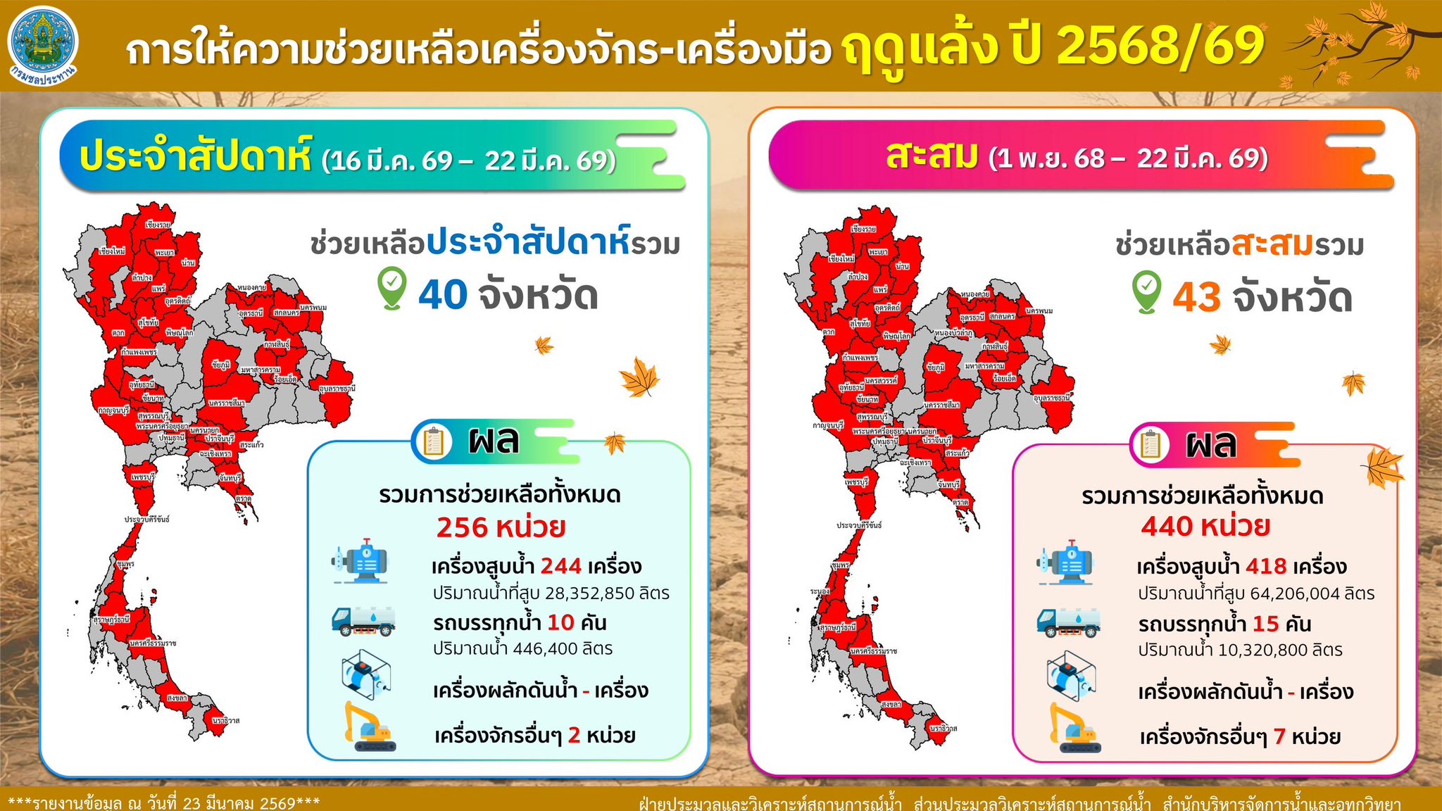 นอกจากนี้ กรมชลประทานได้ให้ความช่วยเหลือด้านเครื่องจักรและเครื่องมือ อาทิ เครื่องสูบน้ำ รถบรรทุกน้ำ และเครื่องจักรกลอื่น ๆ ครอบคลุมทั่วประเทศ รวมสะสมจำนวน 440 หน่วย เพื่อสนับสนุนและบรรเทาผลกระทบจากสถานการณ์ขาดแคลนน้ำ ลดความเดือดร้อนของประชาชนและภาคการเกษตร ทั้งในและนอกเขตชลประทาน พร้อมกันนี้ ยังได้ดำเนินการกำจัดวัชพืชและผักตบชวาที่กีดขวางทางน้ำในลำคลองและแหล่งน้ำต่าง ๆ เพื่อเพิ่มประสิทธิภาพการระบายน้ำและการส่งน้ำ ให้สามารถกระจายได้อย่างทั่วถึงและเพียงพอตลอดช่วงฤดูแล้ง