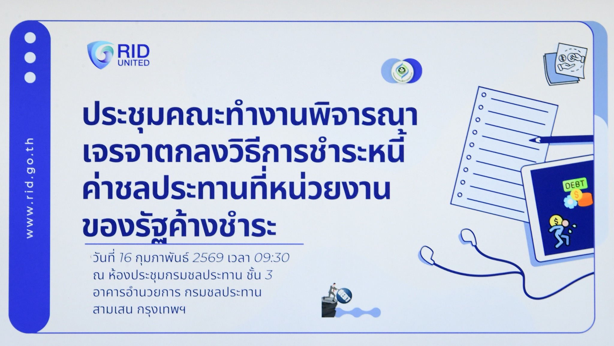 วันนี้ (16 กุมภาพันธ์ 2569) นายทรงพล สวยสม รองอธิบดีฝ่ายบริหาร เป็นประธานในการประชุมคณะทำงานพิจารณาเจรจาตกลงวิธีการชำระหนี้ค่าชลประทานที่หน่วยงานของรัฐค้างชำระ พร้อมด้วยคณะทำงานที่เกี่ยวข้อง เข้าร่วมประชุม ณ ห้องประชุมกรมชลประทาน ชั้น 3 อาคารอำนวยการ สามเสน กรุงเทพมหานคร